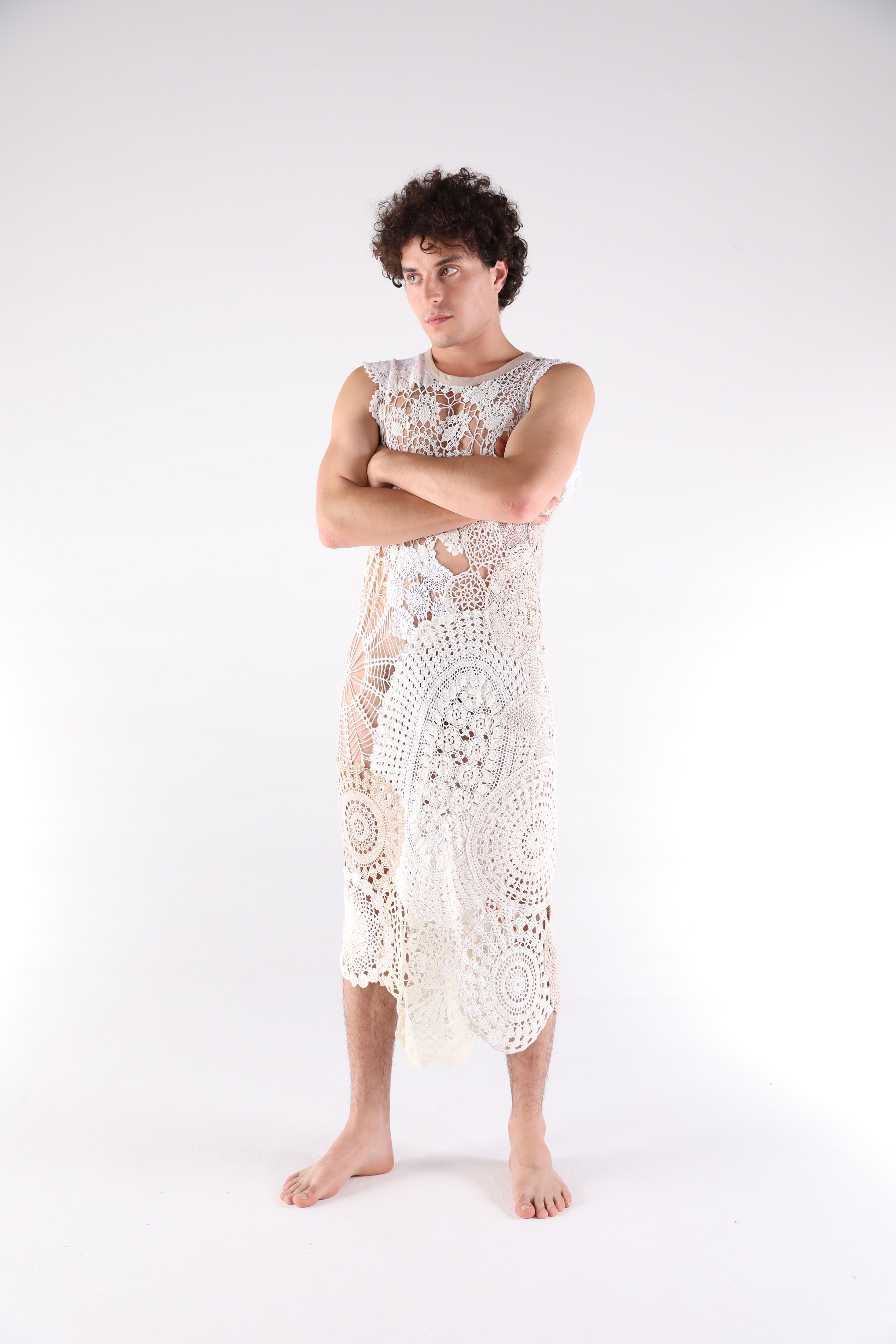 Doily explorations from SS21 are revisited with a lace knit ‘logo’ t-shirt using a rib technique. A shrunken collared dress—an army work shirt front with cotton watteau pleating on the back— draws inspiration from Kurt Cobain and housekeeper’s dress uniforms. These nonchalant acknowledgements express how life should not require grand pronouncements. It is simply expansive.