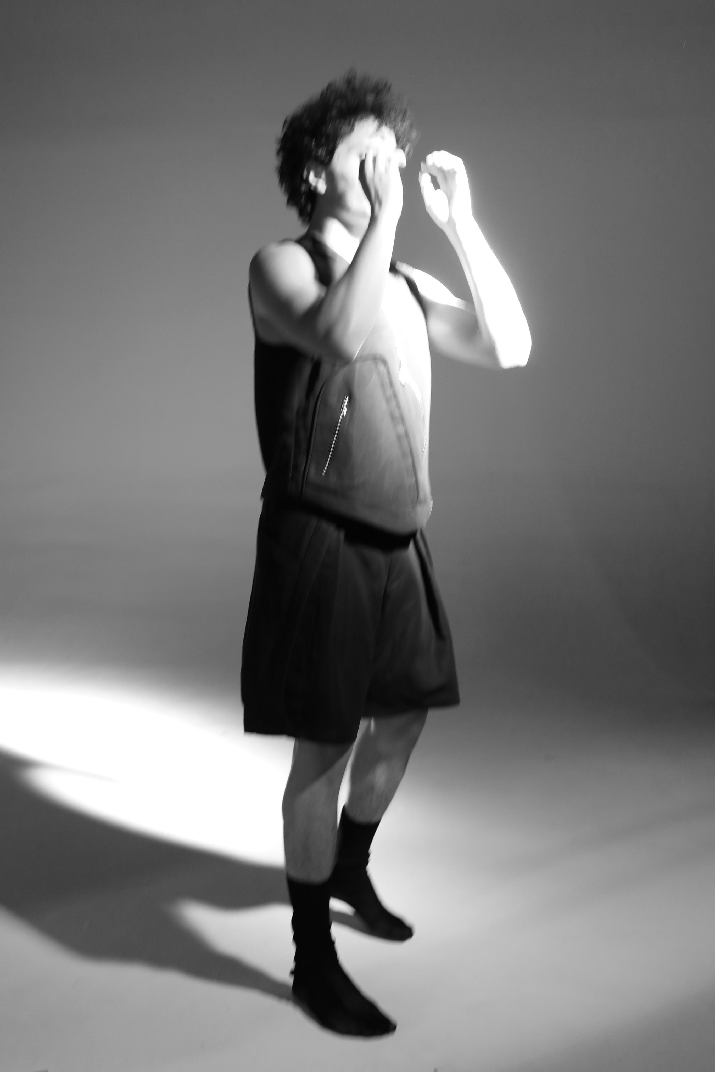 The twisted jersey-meets-nylon jacket in black and ecru is the latest result with frequent collaborator Kathy McGee of Digitoile. For this style, two jackets and a jersey t-shirt were sourced, draped on a fit model, then photographed 360°. The draped photos, after scanning, become the pattern which allows for a more organic process.